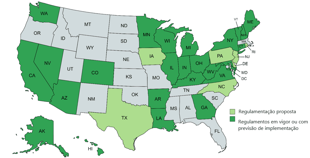 Washington: Em 2018, o estado de Washington aprovou uma lei que proibia a venda de espuma para combate a incêndios contendo PFAS, e o uso dessas espumas para treinamento, exceto quando exigido por lei federal.15