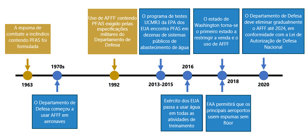 A espuma de combate a incêndio contendo PFAS foi formulada pela primeira vez em 1963. O Departamento de Defesa dos Estados Unidos começou a usar a AFFF para atividades de combate a incêndios relacionadas a combustíveis de aeronaves a partir da década de 19709 10 e então adotou o MIL-SPEC em 1992, que exigia o uso de AFFF.9 Em resposta à descoberta da contaminação generalizada da água potável, em 2016, o Departamento de Defesa restringiu o uso de AFFF durante os treinamentos.11 Em 2018, a Administração Federal de Aviação dos EUA alterou seus requisitos para permitir que os principais aeroportos (com certificação Part 139) utilizassem espumas sem flúor.12 A Lei de Autorização de Defesa Nacional dos EUA de 2020 determina que a AFFF seja eliminada da maioria das operações militares até outubro de 2024.13