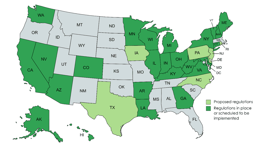 As of May 2023, 32 states have proposed or adopted regulations on the use, sale, or manufacture of PFAS-containing firefighting foams.14 Examples include: