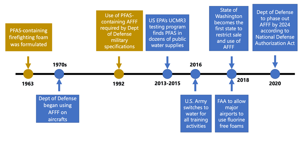 PFAS-containing firefighting foam was first formulated in 1963. The Department of Defense began using AFFF for firefighting activities related to aircraft fuel fire-fighting beginning in the 1970s9 10 and then introduced the MIL-SPEC in 1992, which mandated AFFF use.9 In response to the discovery of widespread drinking water contamination, in 2016 the Department of Defense restricted AFFF use during trainings.11 In 2018, the Federal Aviation Administration changed its requirements to allow major airports (Part 139 certified) to select fluorine-free foams.12 The 2020 National Defense Authorization Act ensures that AFFF will be phased out of most military operations by October 2024.13
