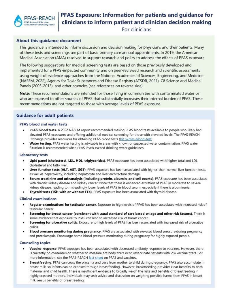 This guidance is intended to inform discussion and decision making for physicians and their patients. Many of these tests and screenings are part of basic primary care annual appointments. In 2019, the American Medical Association (AMA) resolved to support research and policy to address the effects of PFAS exposure.