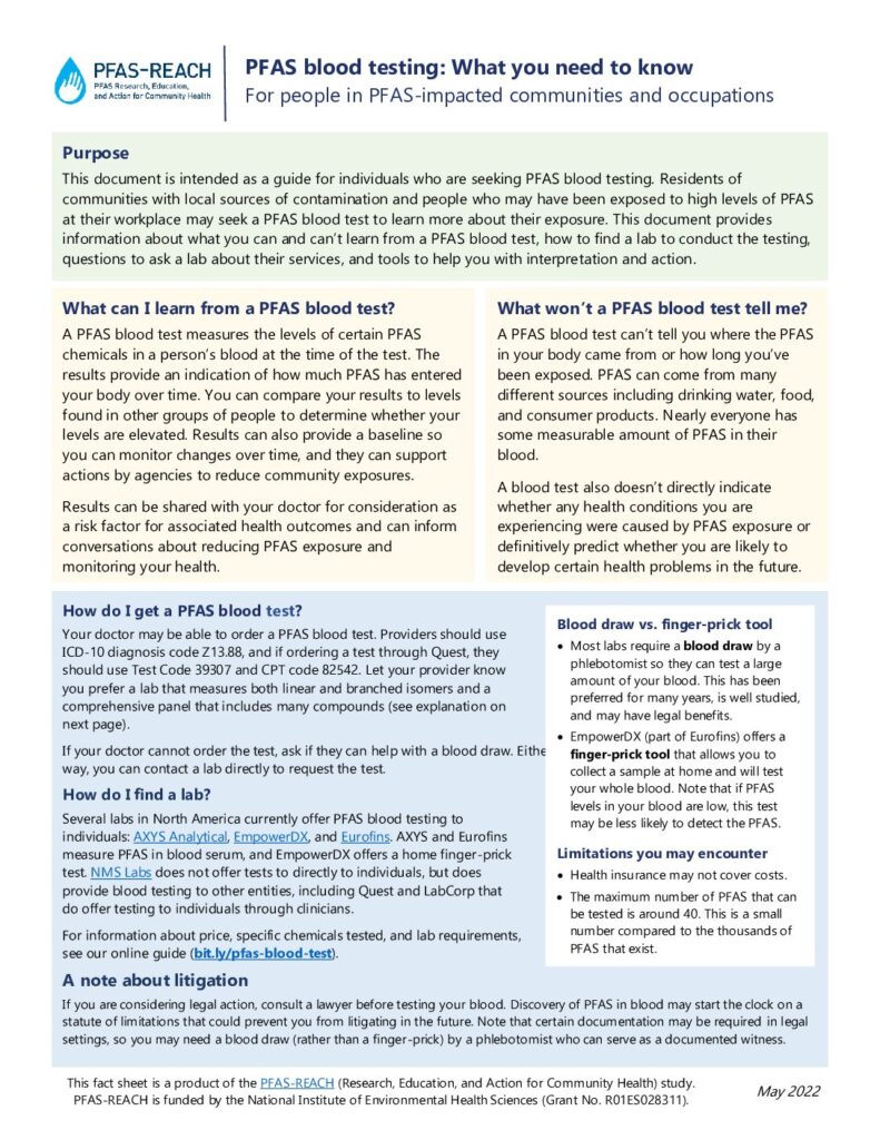 Our PFAS-REACH medical screening guidance, “PFAS Exposure: Information for patients and guidance for clinicians,” has information to help you discuss PFAS blood testing with your doctor.